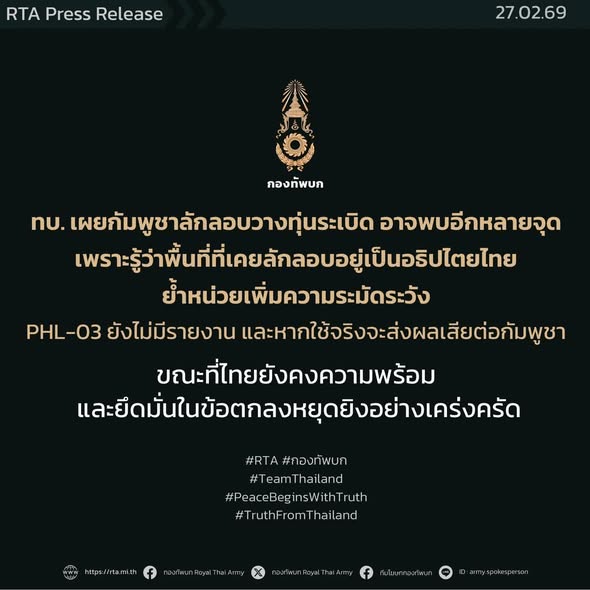 ทบ.เผยกัมพูชาลักลอบวางทุ่นระเบิด อาจพบอีกหลายจุด เพราะรู้ว่าพื้นที่ที่เคยลักลอบเข้ามาอยู่เป็นอธิปไตยไทย ย้ำหน่วยเพิ่มความระมัดระวัง ขณะ PHL-03 ยังไม่พบรายงาน และหากใช้จริงจะส่งผลเสียต่อกัมพูชาเอง