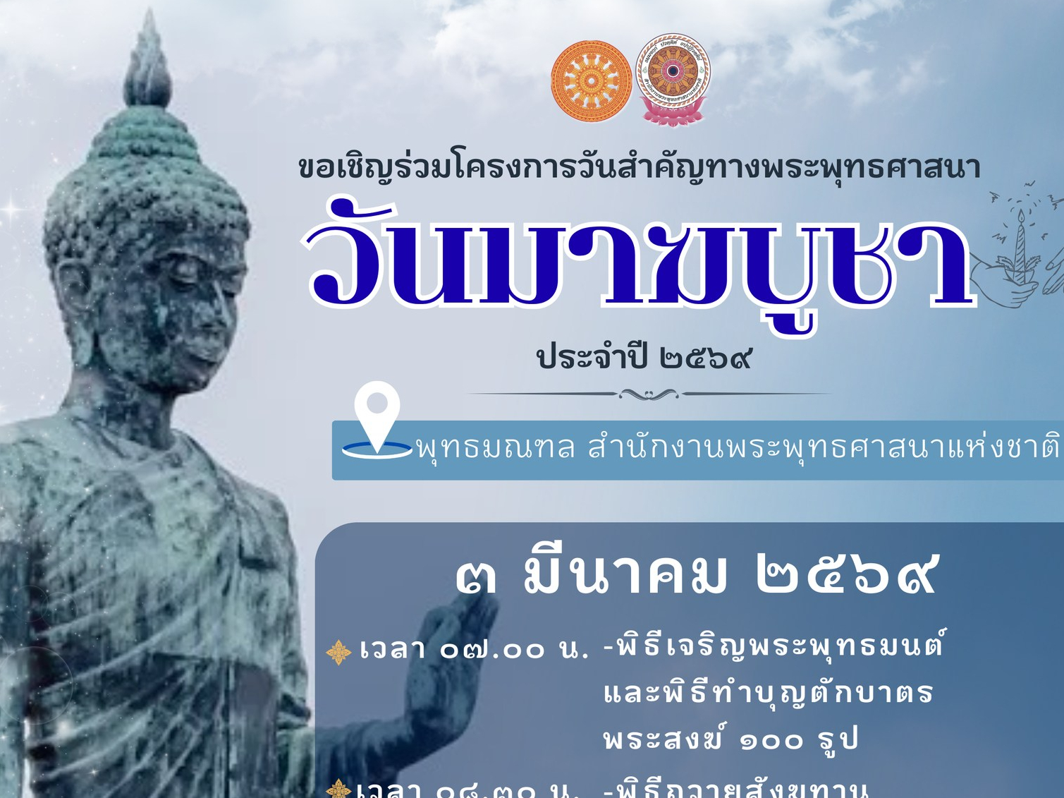 ขอเชิญชวนพุทธศาสนิกชน ร่วมกิจกรรมส่งเสริมการเผยแผ่พระพุทธศาสนา เนื่องในวันสำคัญทางพระพุทธศาสนา วันมาฆบูชา พุทธศักราช ๒๕๖๙ “ละเว้นความชั่ว ทำความดี ทำจิตใจให้บริสุทธิ์ ถวายเป็นพุทธบูชา”